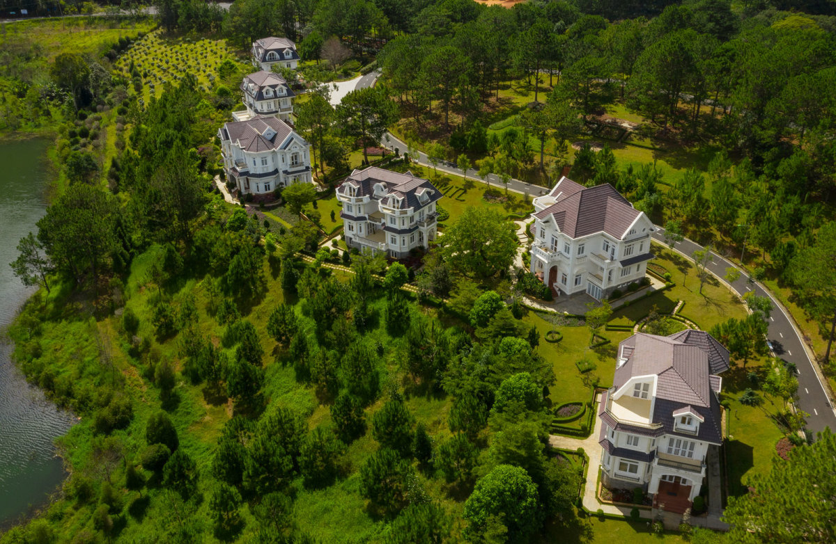Những căn villa được xây dựng trên những bãi cỏ, mặt hướng về hồ Tuyền Lâm. Ở đây, du khách có thể trải nghiệm không gian riêng tư, ngắm nhìn rừng thông mây phủ trong những ngày se lạnh. Các căn villa có 4, 6, 8 và 11 phòng ngủ, thích hợp cho nhóm bạn hoặc gia đình.